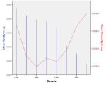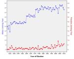 The first graph (left) shows the number of men (blue) and women (red) elected every year from when women were first allowed to join. As you see, the numbers of male Fellows grew rapidly after the Second World War, and then steadied. The number of female Fellows, after some early years’ tokenism, began to grow only much later, in the 1990s.